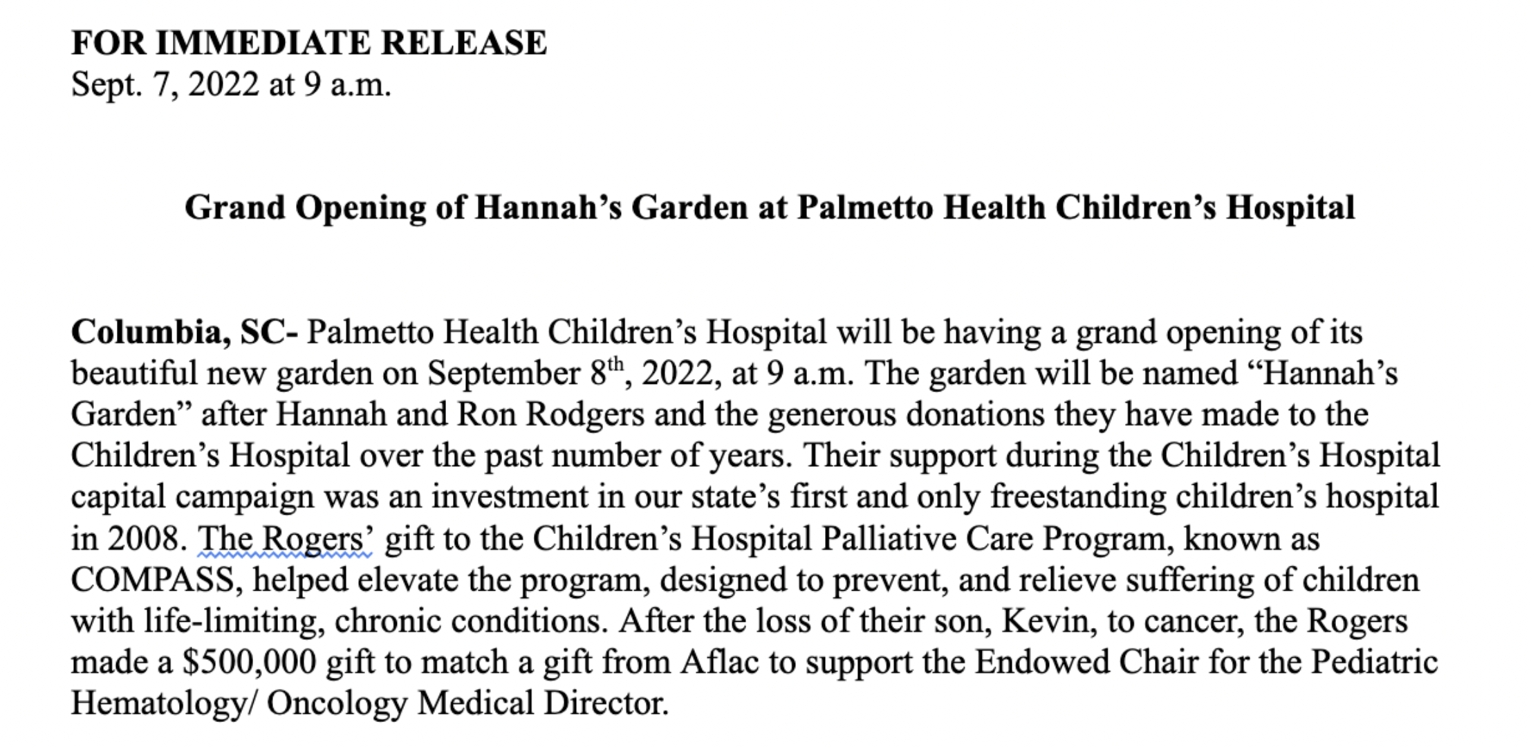 This press release was crafted to announce the grand opening of Hannah Rodgers Garden at Palmetto Health Children’s Hospital. This project allowed me to hone my AP style writing skills and effectively communicate significant achievements and events in a professional context.