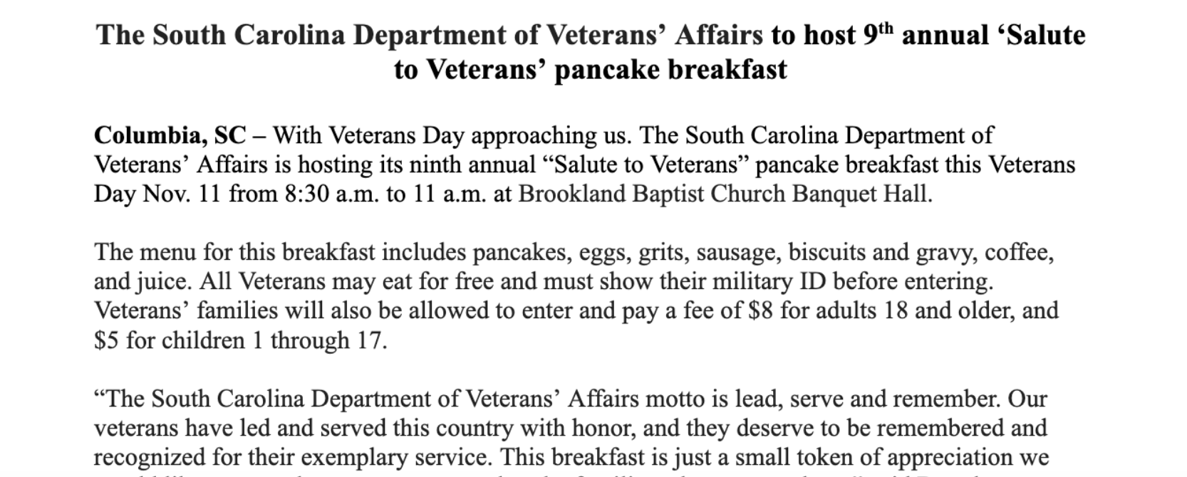 This press release effectively informed the public and media about the South Carolina Department of Veterans’ Affairs' 9th annual ‘Salute to Veterans’ pancake breakfast. Recognized for its popularity among local veterans, the event required comprehensive promotion and media coverage. In this press release, I detailed all aspects of the event, including timing, location, pricing, and other pertinent information. This project enhanced my ability to craft compelling narratives and relay information passionately and effectively.